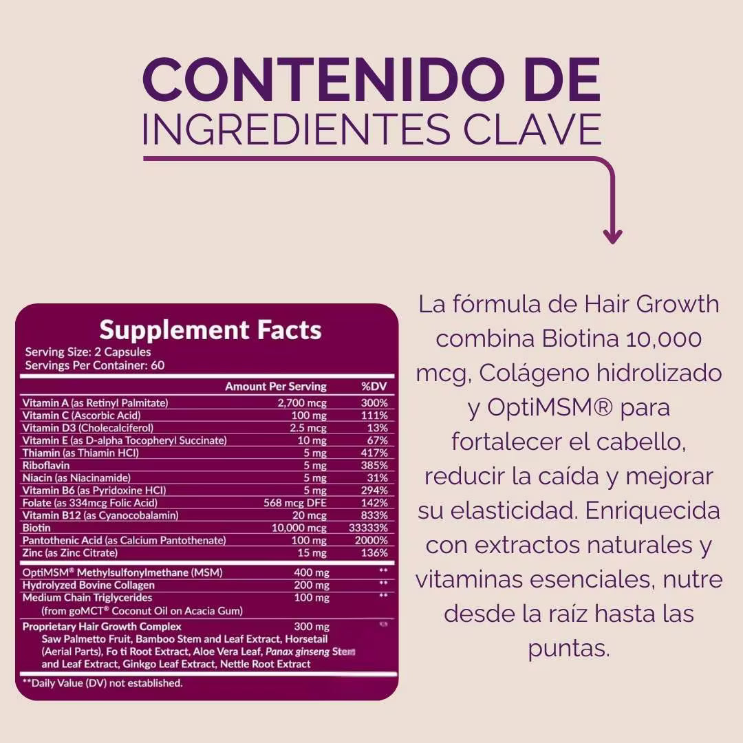 Nuestra fórmula incluye Biotina 10,000 mcg, conocida por fortalecer el cabello y estimular su crecimiento; Colágeno Hidrolizado, que mejora la elasticidad y aporta brillo; y OptiMSM®, un compuesto que nutre profundamente el cuero cabelludo. Cada cápsula está diseñada para ofrecerte el cuidado y la nutrición que tu cabello necesita día a día, con resultados visibles y duraderos.